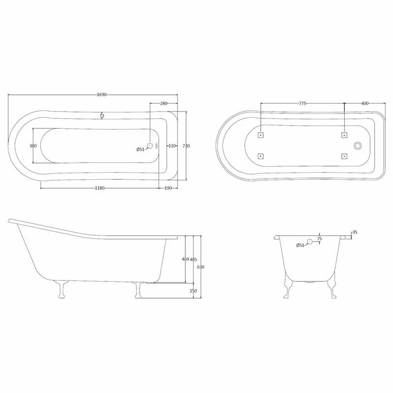 BC Designs Fordham 1700mm Slipper Bath with Feet Set 1 – Polished White – BAU017