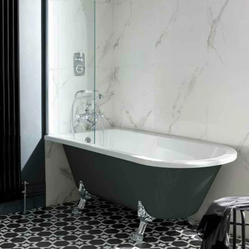 Finish your bathroom with the BC Designs Tye Shower Bath with feet set 1. The Tye bath is a stunning roll top bath with classic design featuring soft curved edges. It features a classic way of incorporating a shower and freestanding style bath into your bathroom. It is also universally handed, so it can fit into any corner to save space. Measuring 1500mm in length, the interior provides a generous bathing area which gives you plenty of legroom and ample space for comfortable relaxing soaks. It has a capacity of 175 litres and coated in a polished white finish that is smooth to touch and will coordinate effortlessly with other bathroom fittings. It is supplied with feet set 1, which is a stunning Edwardian style feet that is ideal as a finishing touch to add to the bath.