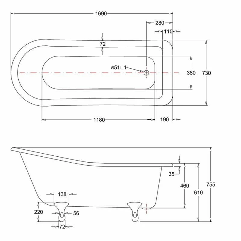 Burlington Harewood 1690 x 730mm Freestanding Bath No Tap Holes – White – Details