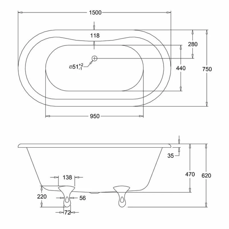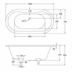 Burlington Windsor Double Ended 1500 x 750mm Freestanding Bath No Tap Holes – White – Details