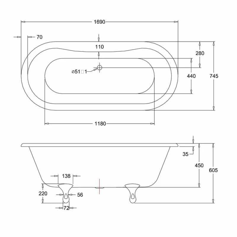 Burlington Windsor Double Ended 1690 x 745mm Freestanding Bath No Tap Holes – White – Details