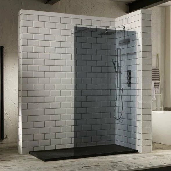 Tinted walk-in panel. Made from a single sheet of 10mm glass – it adds extra privacy to your showering area whislt adding style at the same time. The Aquaglass tinted shower screen is thick, and has a toughened design whilst the frameless look heightnes the feeling of space in your bathroom. Can be paired with a black shower tray to complete the look.