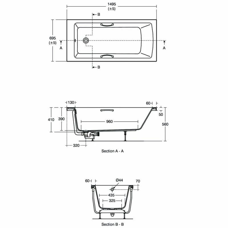 Ideal Standard Tempo Arc 1500x700mm Idealform Plus+ Bath with Chrome hand grips – White – E155601