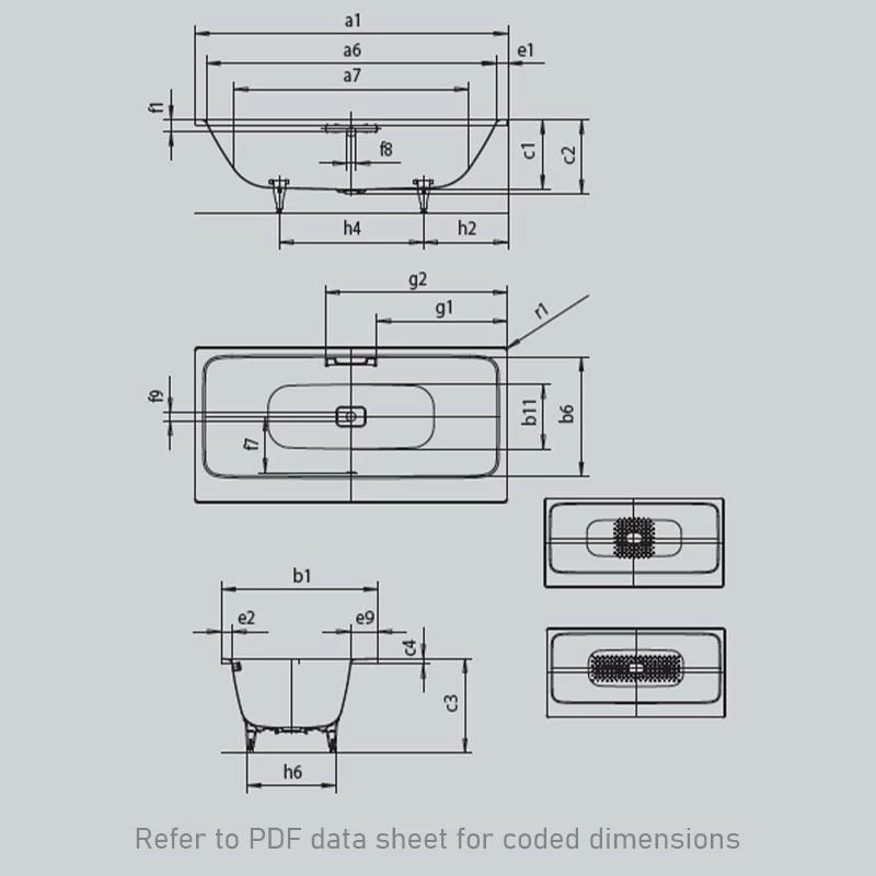 - Enamelled waste cover and overflow knob integrated in the bath design (also available with filling function)