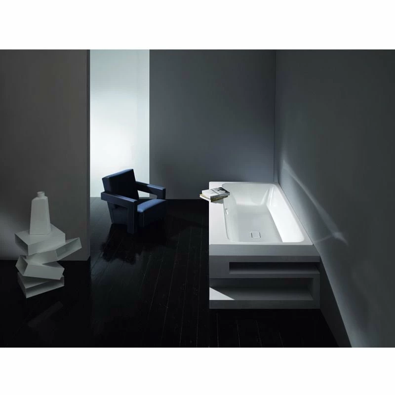 There is a charming contrast between the precise and clear form of the bath rim and the ergonomic, flowing design language of the inside. Furthermore, the outflow set flush into the base of the bath is an elegant and harmonious solution.