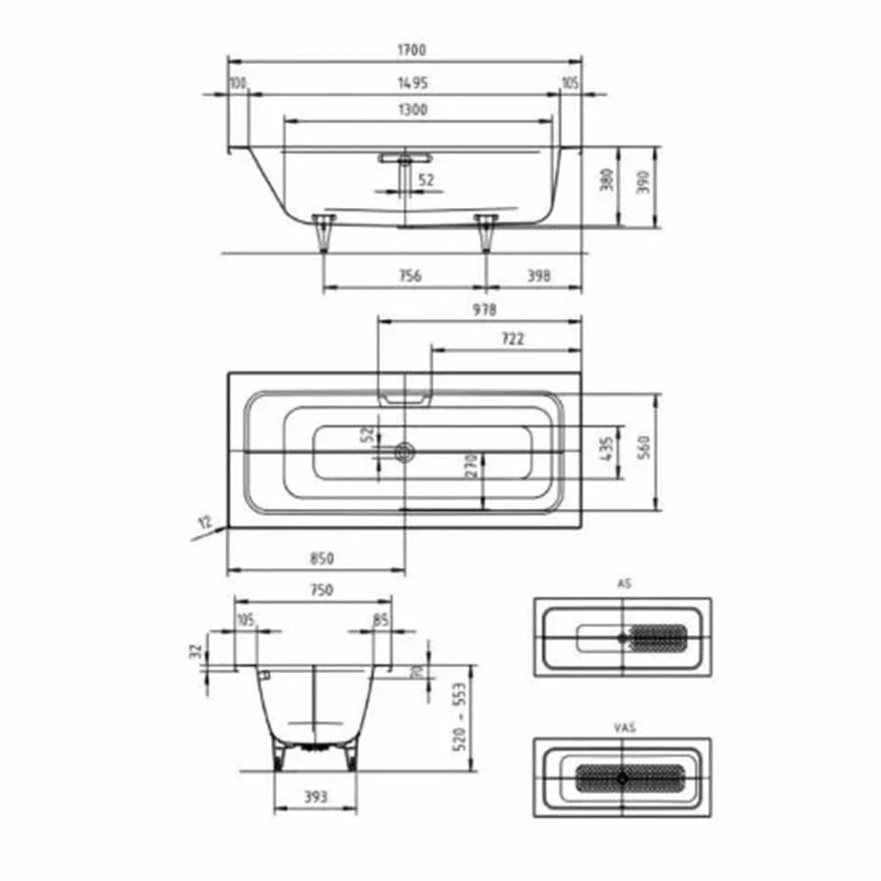 Kaldewei Puro Set 1700x750mm Wide Double Ended Bath With RH Overflow – Alpine White – Details